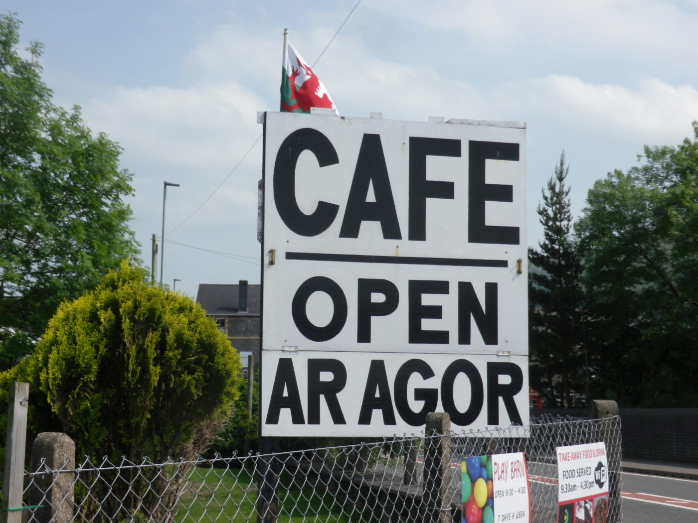 その下の三枚はウエールズからの帰りに寄ったカフェです。カフェの看板の下の文字「ARAGOR]はウエールズ語で「OPEN」の意味、英語とはまったく異なるケルト系の言語です。 このカフェはクラフトセンターも兼ねていて木工品が並べてありましたが、入り口の近くに置いてあった二つの人形がよくできていて、つい写真に撮ってしまいました。