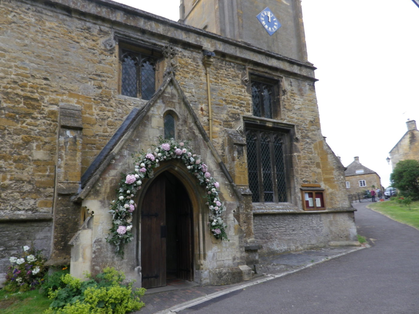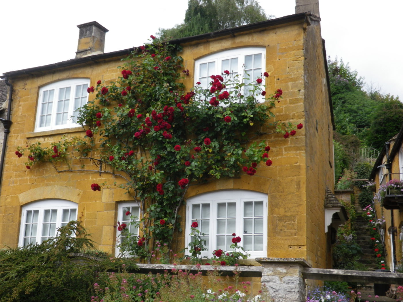 バラの花で飾った入り口のアーチは Blockley の村の教会です。前日に結婚式があったらしく、内部も同じバラできれいに飾られていました。赤いバラが這う家も同じ村にあります。村を抜けて野原に出て撮ったのが下の写真です。今回、教会と赤いバラのつたう家以外の写真はジョンが撮たものです。野原の写真は、石垣と野原と遠くに見える家のグラジエーションがいいと本人は言っていますが、どうでしょうか?