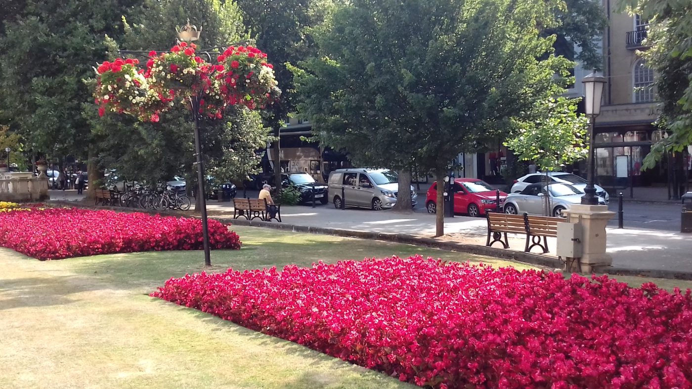 チェルトナム市内では、6月から9月頃まで商店街を中心にハンギングバスケットが飾られます。色鮮やかな、ボリュームたっぷりの花のバスケットはイギリスの夏の風物詩と言えるでしょうか。雨が降らないのに生き生きとしているのは、市の職員がせっせと水遣りをしているのでしょう。市庁舎の窓辺も花で飾られ、大通りの花壇も定期的に花が植え替えられ、夏の間は街がより華やかになります。 チェルトナムはイギリスで住みたい町のベストテンに入っているそうなので、市としてはきれいな町のイメージを保つのにも熱心なのかもしれません。今年も上がった高い市民税、街をきれいに保つのにはかなりの予算が組まれるのでは、と、カラフルな花を眺めながら、ちらっと頭をかすめてしまいます。写真にあるバスケットの上の部分に王冠の飾りがあるのがいかにもイギリスらしいです。