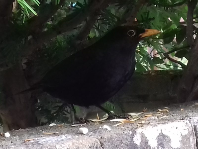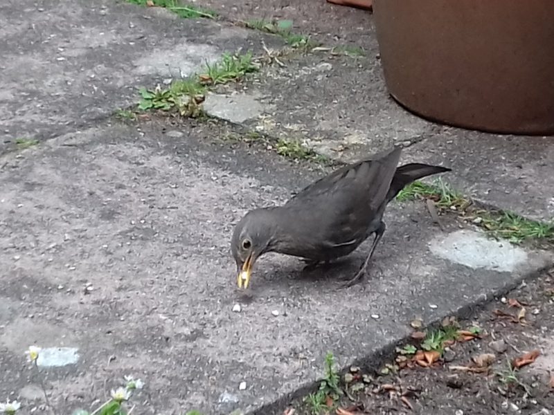 ブラックバードのメスです。餌をやるとせっせと巣に運びます。