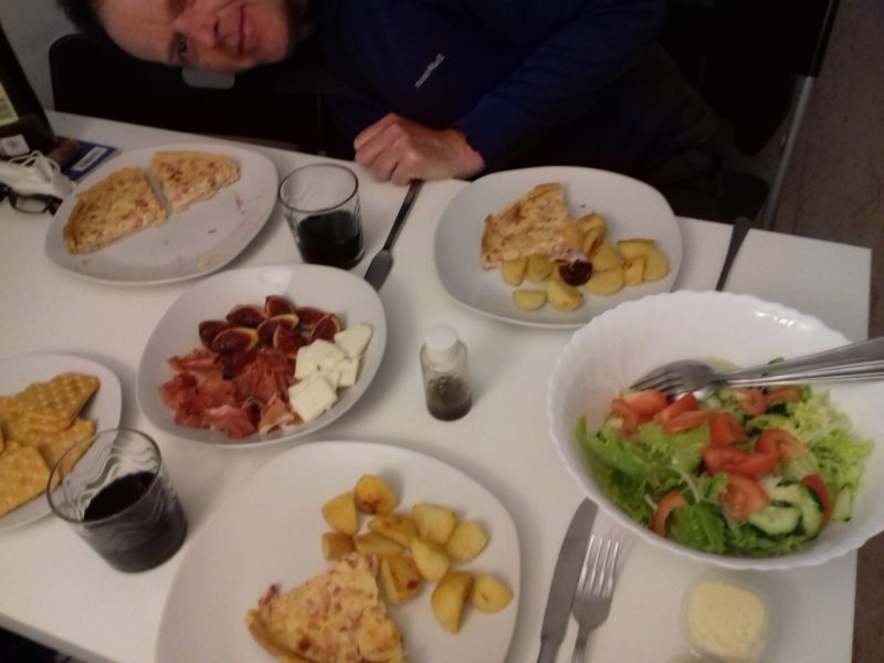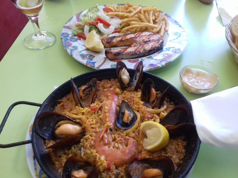 このホテルをベースに海岸を歩いたり、ローカル線に乗って近くの町に行ったり、ハイキングコースを見つけて歩いたりして過ごしました。久しぶりの異国の地、私には海岸や街をブラブラ歩くだけでも新鮮に感じたものです。日中の気温は20度前後と泳ぐには寒いのですが、イギリスに比べて地中海の水はそれほど冷たくなく、晴れた日には波打ち際で水着姿で遊んでいる家族連れをチラホラ見かけました。休暇中の私にとっての楽しみのの一つはイギリスでは食べられないシーフッドです。イギリスも海に囲まれているのにどうしてこんなに食生活が違うのか、とは南ヨーロッパに来るたびに感じることです。私がなにがおいしそうか、と目を皿のようにしてメニューを眺める脇で、ジョンは自分が食べられそうな安全なものを探します。けっして冒険はしません。レストランの食事はどれもおいしいのですが量が多いので、夕食の半分くらいはスーパーで買った出来合いのもの(これもけっこういけるのです)を安くておいしいワインで食べていました。