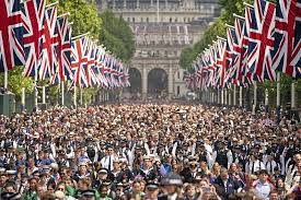 お祝いの行事に4日間もかけ何をするのだろう、と思っていたのですが、そこは伝統行事なのでしょうか、さまざまな催しものが用意されていました。初日はバッキンガム宮殿の前を衛兵達の行進、Trooping the colourと呼ぶそうです。ロイヤルファミリーのメンバーが宮殿のバルコニーからご挨拶です。行進の次に軍用機のパレードがあり、第二次大戦で活躍した戦闘機も堂々と宮殿の上空を飛んでいました。宮殿の前の広場から続く沿道は見物人でギッシリと埋まり、遠くはアメリカ、オーストラリアなどの国から来た人もいたそうです。