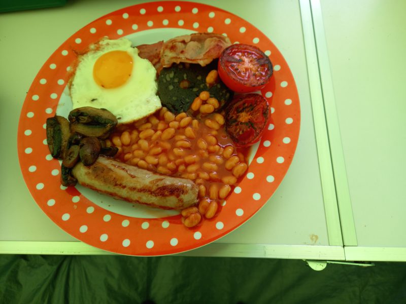 翌日は予報を裏切って朝から雨と強風、谷から吹いてくる突風でテントが大きく揺れます。日本の台風並みの強い風にテントの張り綱を補強はしましたが、薄いナイロン一枚の壁、それにしてもテントの揺れがひどい、とジョンは外に出て調べてみると入口に近いテントのポールが折れていました。そういえば、ジョンがテントから離れた時に、パキン、とした音が聞こえたのですが、まさか新品のポールが折れた音とは考えもしませんでした。頑丈なテープで折れた個所を何回も巻いて修理しましたが、荒れ模様の天気は夕方まで続き、突風が来るたびにジョンが両手を拡げてテントの壁(?)を支えていました。ハイキングどころではなく、一日のほとんどをテントの中で過ごすはめになりました。それでも小さなテントと比べると内部が広くて居心地がよく、突風が来るごとにジョンが両手を拡げるので、その様子がコミカルで笑いながら、嵐が収まる頃には持参の本を一冊読み終えてしまいました。この日の夕食は湖水地方名物のソーセージとオムレツ。食料はもちろん、卓上のコンロ、やかん、ティポット、それに今回は家で使っている枕まで持ってきました。好きなものを持ち込めるのはオートキャンプならではです。キャンプ場を見回すと、カップルや子供のいる家族は私たちのと似たような大きなテントで、一週間もキャンプ場に滞在するのもめずらしくないようで、いかに快適に過ごすが、それぞれ工夫している様子がうかがえます。