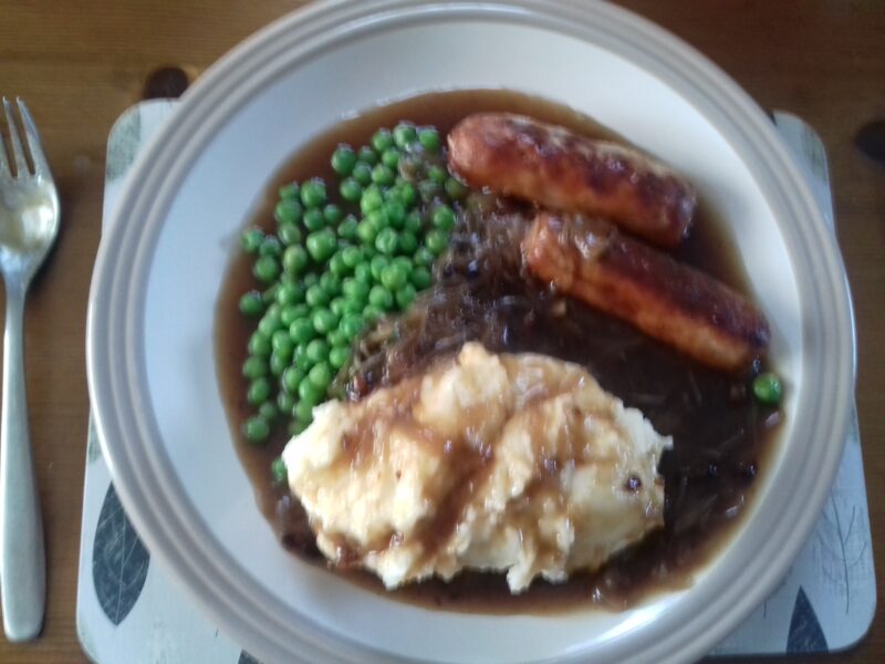 実際、スーパーで他の買い物客のカートを見ると、冷凍やチルドの出来合いの惣菜が目につきます。ほとんどの主婦が仕事を持っているこの国では、料理にかける時間が短く、日々の食事は簡単に済ませられるものになるのでしょうが。根底にはイギリス人の食に対するこだわり(文化?)が低いと思われます。料理をする人も短時間で用意できるものに頼ります。そこで人気があるのが瓶に入ったカレーやシチューのさまざまなソース類です。玉ねぎとチキンを炒めてこのソースを加えれば出来上がりです。スパゲティーのボロネーズ(ミート)ソース(スパッズボールとイギリス人は呼びます。も度々登場するメニューです。これも玉ねぎと挽肉を炒めたものに缶詰や瓶に入ったトマトソースを加えれば出来上がりです。ポークやチキンをフライパンで焼くのも一般的ですが、日本のように薄切りの肉がないので、簡単に炒めて、という訳にはいきません。それでも素材を使っているので、添加物の入った出来合いの総菜に比べればずっとましです。テイクアウトでピザを買う人もいますが、この物価の高騰下、スーパーの冷凍品やチルドのピザの方がずっと安くつきます。外食はというと、夕食は高いし、日本のように気軽に行けるレストランも少ないので、裕福な人は別として、一般の人(庶民)は、誕生日などの特別な日に行くぐらいでしょうか。
