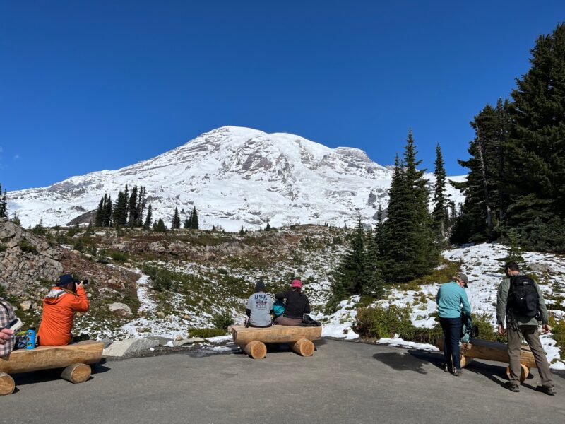 この旅行の主目的はNさんの希望でMt.レーニエを眺め、その周辺を歩くことです。到着日と翌日を予定していたのですが、雨で実現しなかったのですが、北部の海岸に移動後、南部の「晴れ」の予報を知って、急遽Nさんの帰国前日に国立公園に戻ることにしました。朝6時半に出発し、高速道路をひたすら南下、降りてからは国立公園内の山道を延々と上り、11時頃にビジターセンターに到着しました。雪で真っ白なMt.レーニエがすぐ目の前にそびえています。週末の好天気ということもあり人出も多く、かなり混みあっていました。カゼを引いて体調を崩した私を除く3人はさっそく周遊コースを歩きに出かけました。正直、私にとっては歩けないくやしさよりも、Nさんの旅行最終日に快晴となり、二人の希望がかなってよかった、というホッとした気持ちの方が強かったのです。高齢のご両親のお世話をしているNさんがなんとか周囲を説得して実現した旅行だったのです。