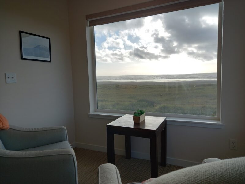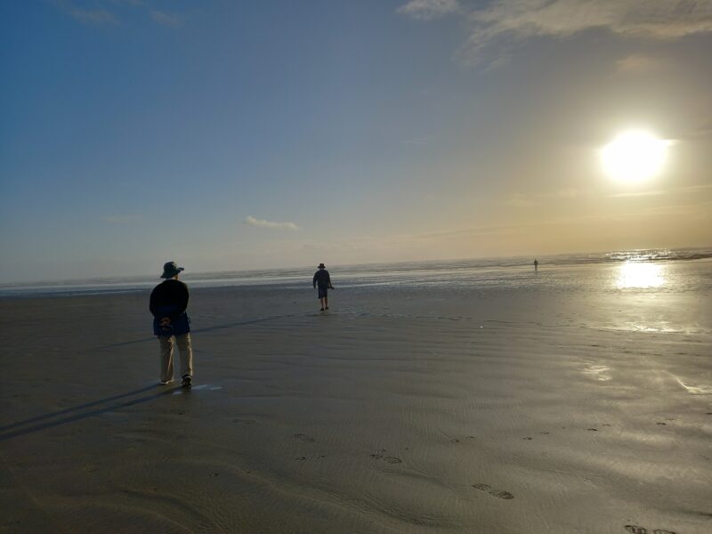 翌日は州北部の海岸沿いにあるホテルを予約してあったので、高速のインターステイツ5を北上、州を斜めに横切る形で海岸線に出ました。天気も徐々に回復してきて、海岸のリゾート地にある宿に着いた時には青空になっていました。アパート式になっていて、リビングの大きなガラス張りの窓からは遮るものがまったくない広い海岸が見えます。人影がない静かな夕方の浜辺を散歩した後は夕食。前夜にテイクアウトで買った大きなピザは4人で食べてもまだ半分残っていたので、それを温め、あとは自前のサラダとビールのいうささやかな夕食も、暮れていく海を眺めながら食べるとちょっと贅沢な気分になります。