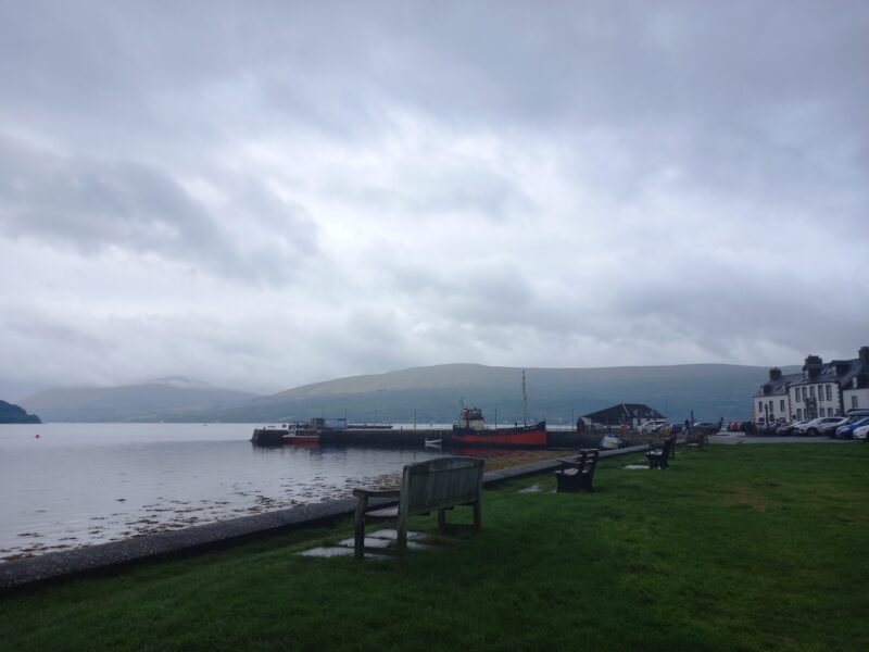 無事に2人がチェルトナムに到着、二日後に車でスコットランドに向けて出発しました。途中、湖水地方に一泊して、翌日にスコットランド入りして北上、次々と現れる湖の間を通りながら、西側の港町、オーバン(Oban)に着きました。ハイランドの南端にあるこの町に二泊して、近くの島にフェリーで渡って観光する予定でしたが、あいにくの雨で、また風も強いため島に行くのを諦め、近くの海岸沿いドライブをし、オーバンの町を散歩しただけの一日でした。宿は市内のアパート形式の部屋で、海がすぐ目の前に見えます。寝室が3つ、居間とキッチンがついています。一日目は持参したチリコンカン、二日目はアパートの階下のインド料理のお店からテイクアウトのカレーと、レストラン行きを省け、節約になるのもキッチン付きのいいところです。