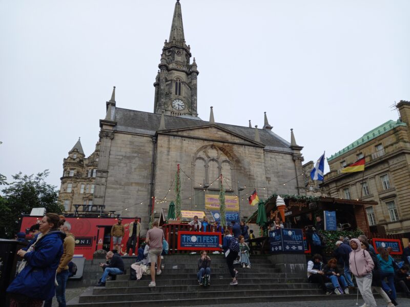 スコットランド旅行の主な目的はエジンバラで毎年8月に開催されるミリタリータトゥーを観ることでした。エジンバラ城の城内のコートが舞台で、周囲に観客席が設置され、ショーの開始はなんと夜の9時半です。とても人気があるそうで、国内や世界中から来た人たちで3週間におよぶショーはすべて満席とのこと。この日はオーバンを早めに出て3時間かけてエジンバラに移動、午後は一緒にエジンバラ市内を観光し、その後は自由行動としました。この期間はエジンバラフェスティバルが開催中でもあり、タトゥーだけでなく、さまざまな演劇やコンサートなども開かれ、お城の周辺はストリートパフォーマーも出ていてとても賑やかです。