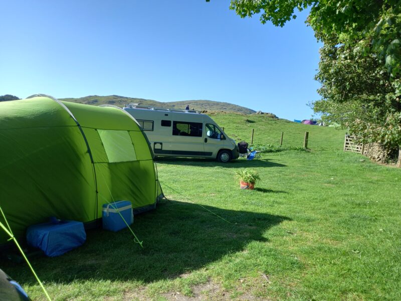 当日、湖水地方の賑やかな中心から外れて田舎道を走り、ようやく辿り着いたのは、放し飼いの羊以外周囲には何もない野原にポツンと建っている農家でした。キャンプサイトは牛の納屋の隣の芝生の空き地で、テントにいると時々牛の鳴き声が聞こえてきます。その納屋の隣にトイレとシャワールーム、少し離れた母屋の隣には小さな洗い場と冷蔵庫、冷凍庫が置いてありました。こんな辺鄙な場所にあるキャンプ場でも、設備が揃っているのはさすがに国立公園内にあるからでしょうか。着いた日は私たちと同じような大型のテントとキャンピングカーが2台だけでとても静かでしたが、週末はさすがにテントの数がグンと増えました。一時間かかってテントを設営し、ここで4日間、周辺を歩いたり、海岸沿いをドライブしたりして過ごしました。